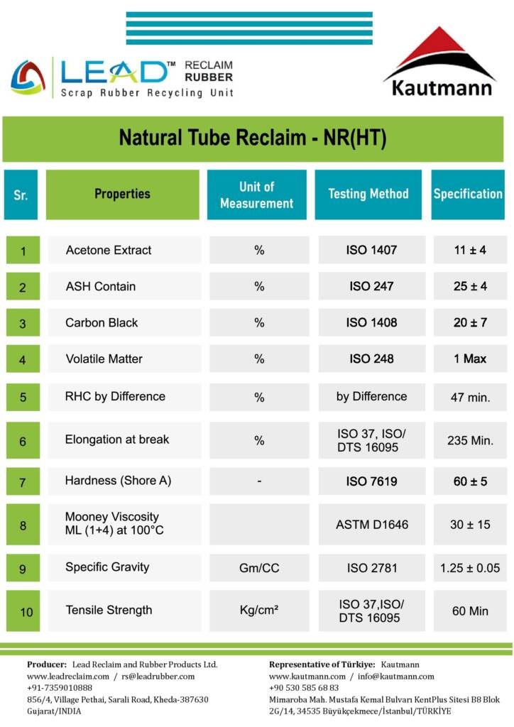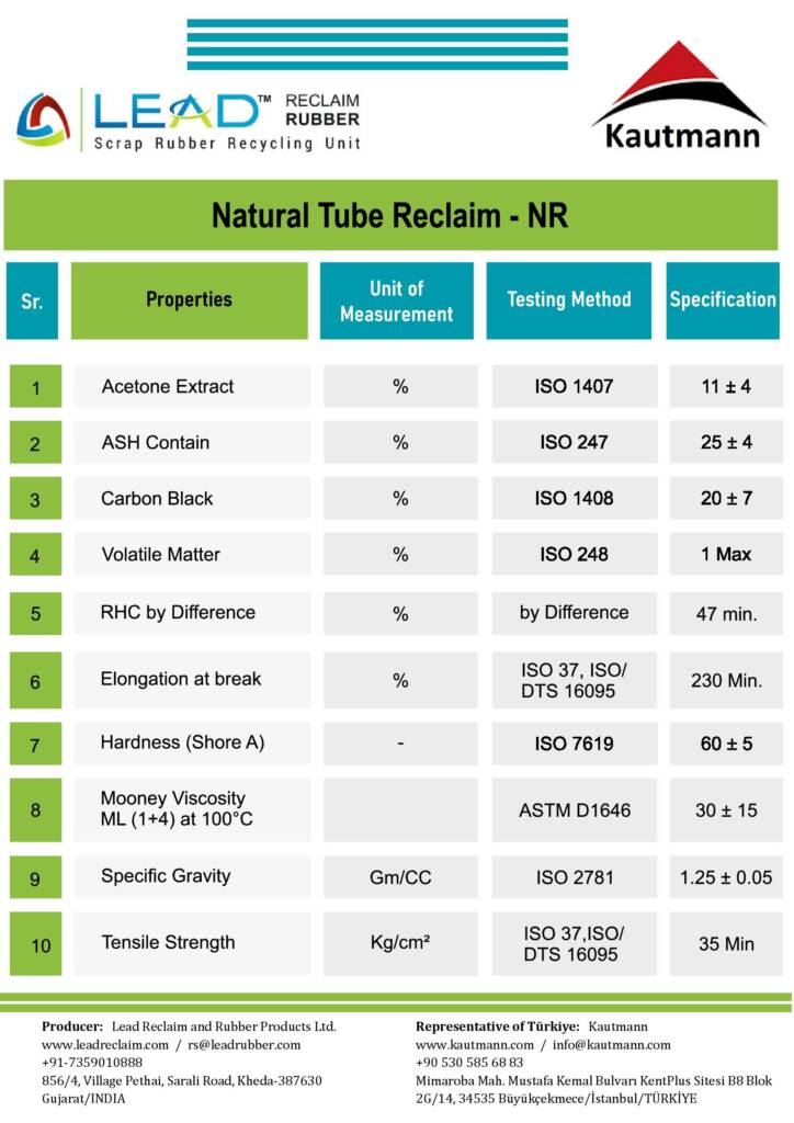 İyi donanımlı ve modernize edilmiş makinelerle naturel kauçuk tüp hurdasından geri dönüştürülür. Günümüzde naturel geri dönüştürülmüş kauçuğun kullanımı ev ürünlerinden endüstriyel ürünlere kadar oldukça yaygındır